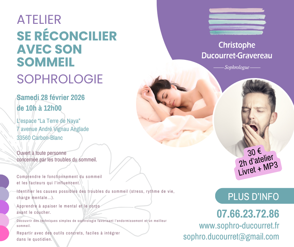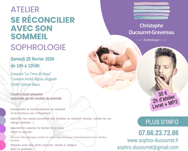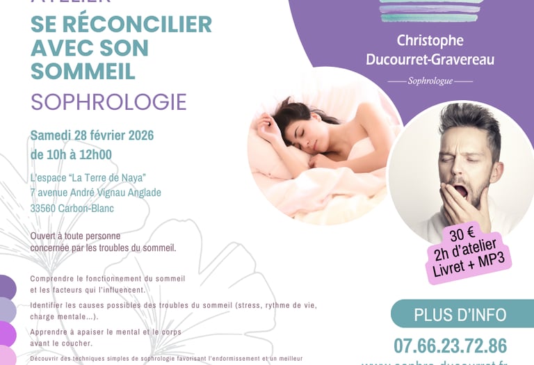 Spécialisé depuis plusieurs années dans les troubles du sommeil, la gestion du stress et des émotions, avec la sophrologie, je peux vous apporter des solutions simples et efficaces pour vous soulager et vous permettre de retrouver bien-être et équilibre.