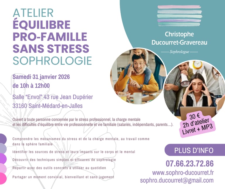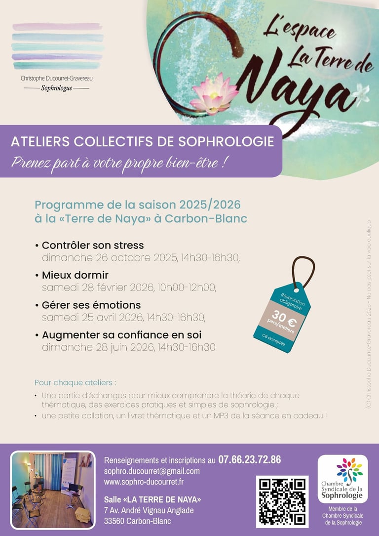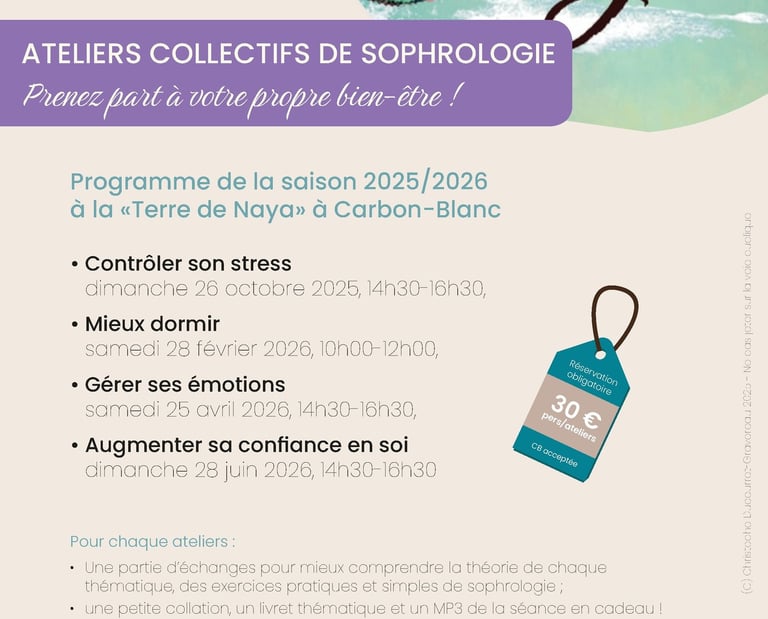 Dans l'année, je propose une vingtaine d'ateliers thématiques (sommeil, confiance en soi, émotions, pleine conscience, résilience et gestion du stress), ou des ateliers co-animés avec un(e) autre praticien(ne), dans différentes communes de la métropole bordelaise.