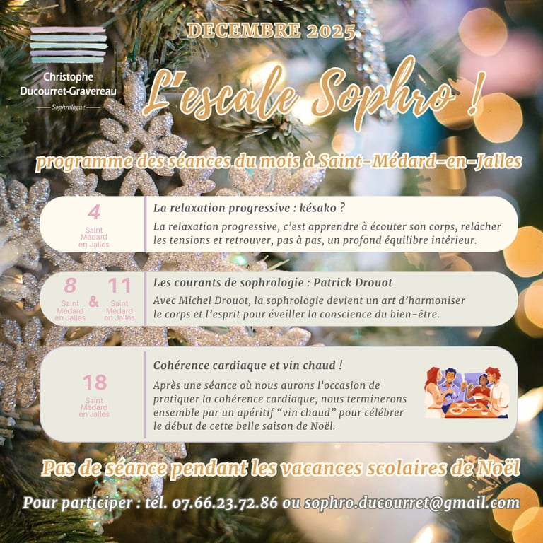 Vous pouvez pratiquer ces séances de septembre à fin juillet, au rythme que vous souhaitez, tous les lundis et jeudis soir de 19h à 20h à Saint-Médard-en-Jalles. Elles sont accessibles, à partir de 18 ans, aux débutants ou aux personnes ayant déjà pratiqué la sophrologie. Chaque séance abordera une thématique différente (la gestion du stress, l'anxiété, les troubles du sommeil, retrouver le calme, se détendre) en vous proposant des exercices simples et facilement praticables dans votre quotidien. Contrairement aux séances individuelles, les séances collectives n'abordent pas les problèmes personnels.