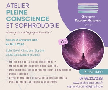 Je partage également les bienfaits de la sophrologie à travers des ateliers thématiques, ouverts à tous, pour toucher un public plus large sur des problématiques du quotidien.